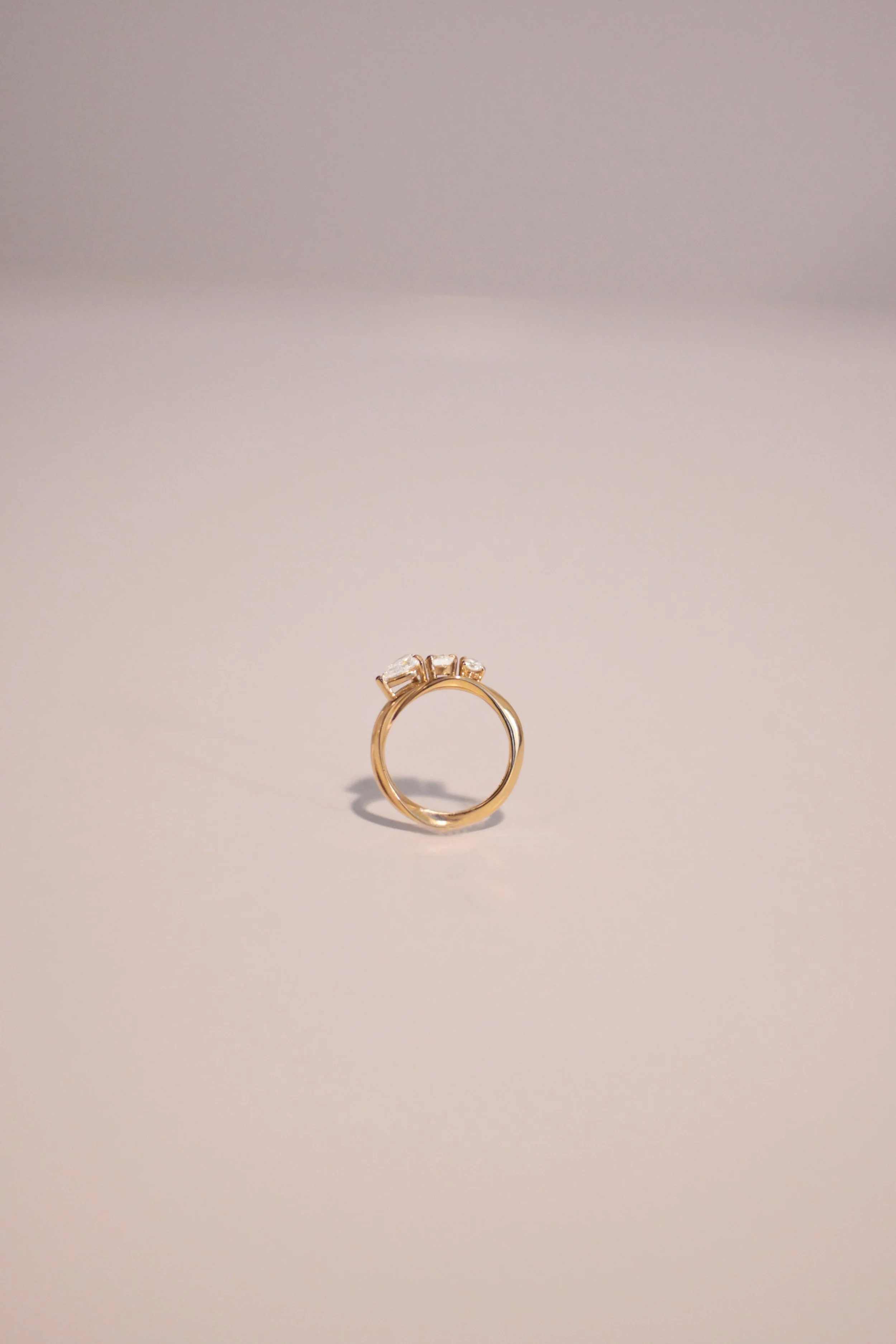 I lembi dell’anello, nell’atto di cingere il dito si diramano con impercettibile irregolarità, creando raffinate asimmetrie. Le tre pietre di dimensioni e tagli diversi appaiono sospese ed eteree.